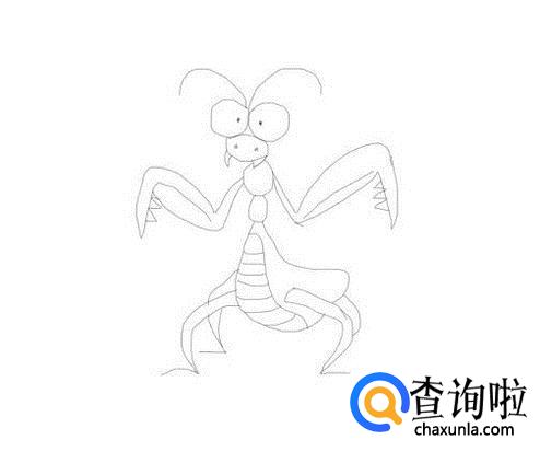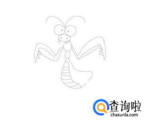 在头部的下面再画出螳螂的身体,然后在身体上画出螳螂的肚子,如图所示: