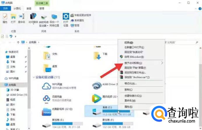 首先在电脑的相应磁盘里点击“授予访问权限”。