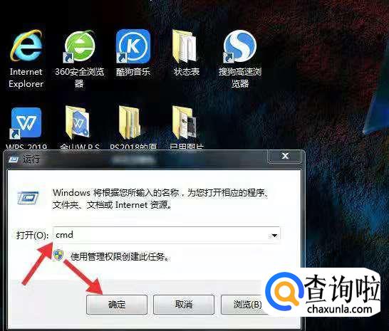 然后在电脑的菜单中运行窗口输入“cmd”在点击“确认”选项。