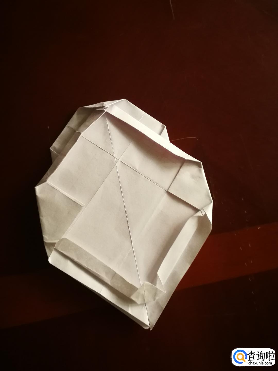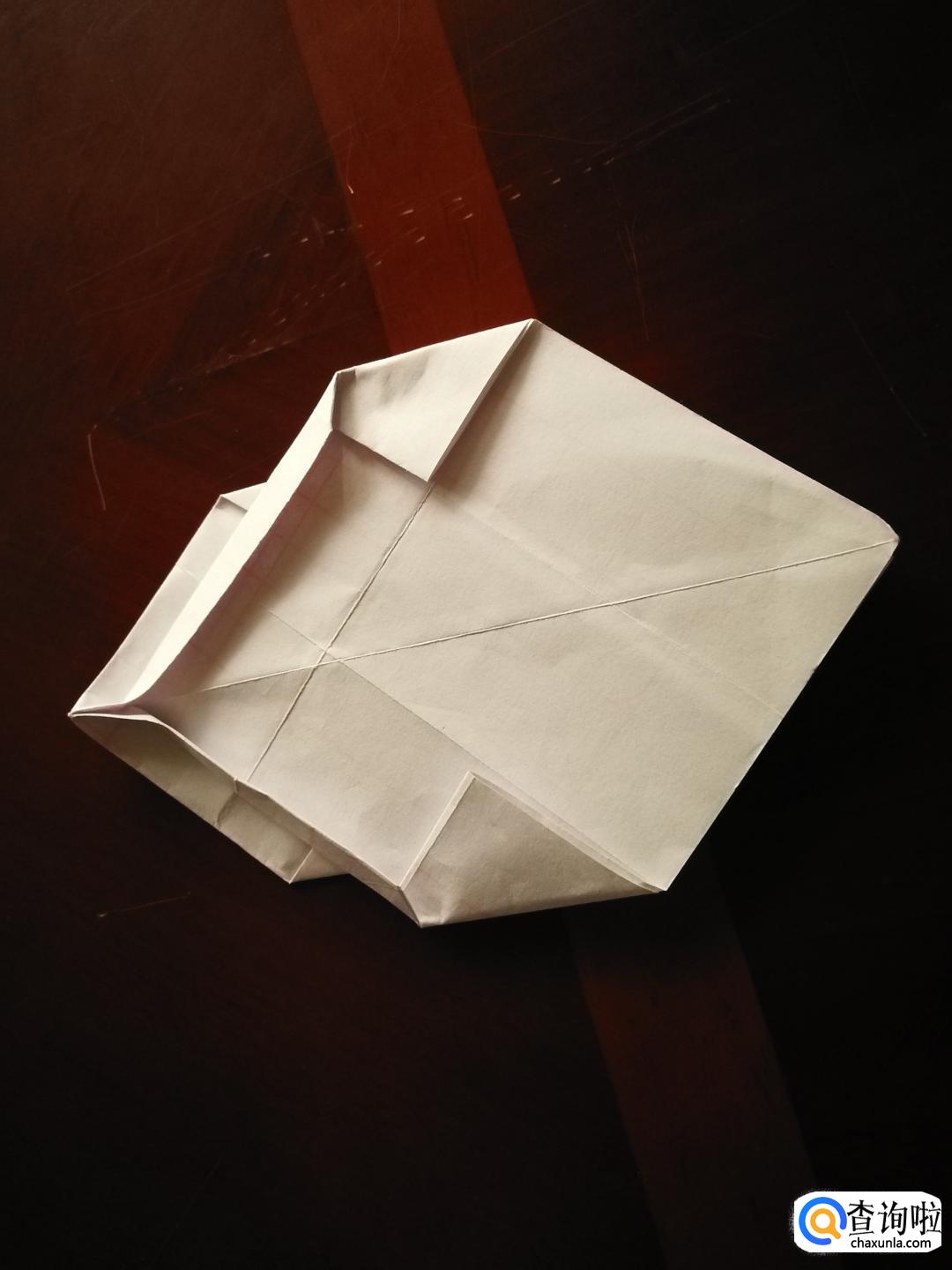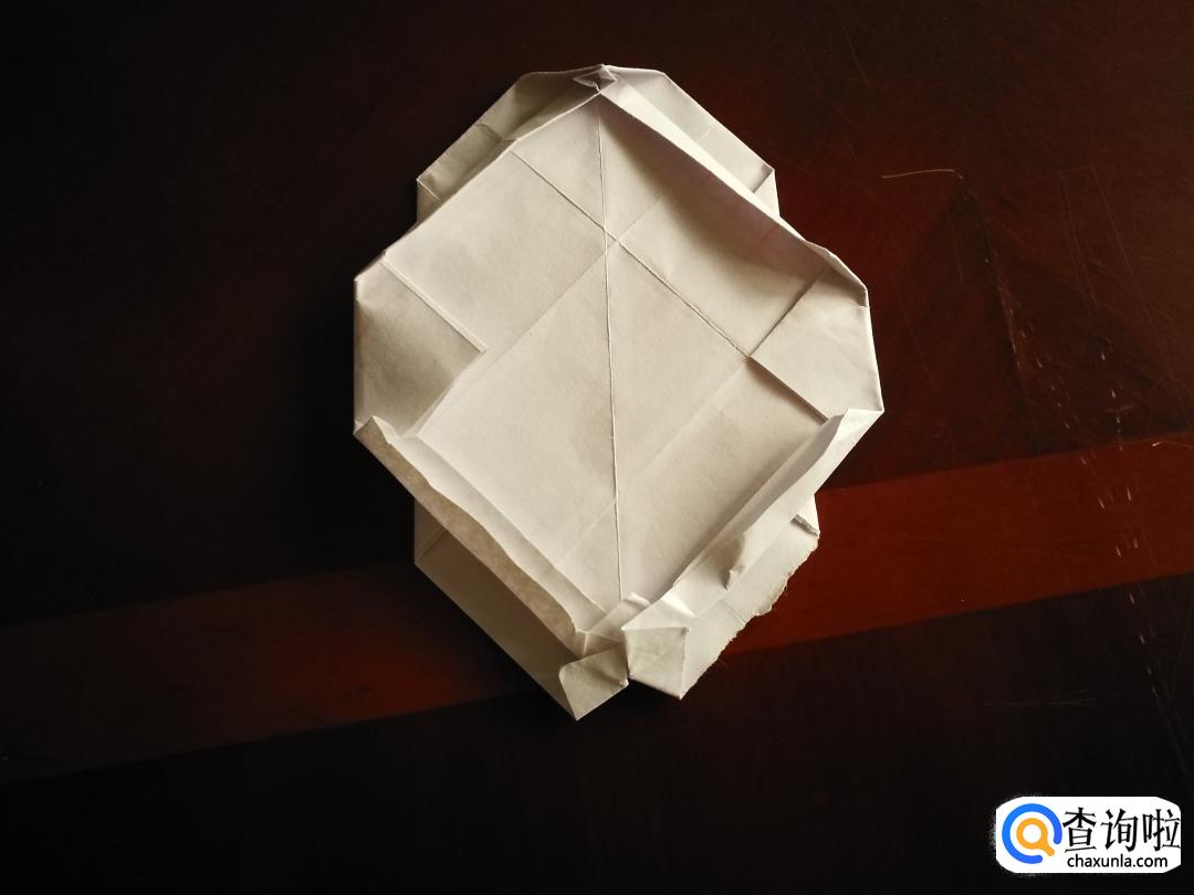 把底端折不平的三角形捏着角向内缩,形成一个小正方形。再把上面的相邻两条边也向里折叠一小段。