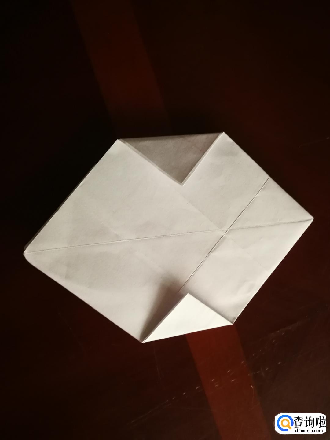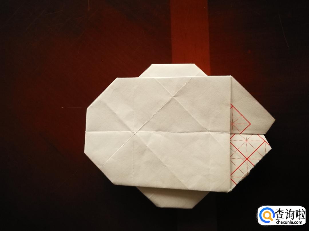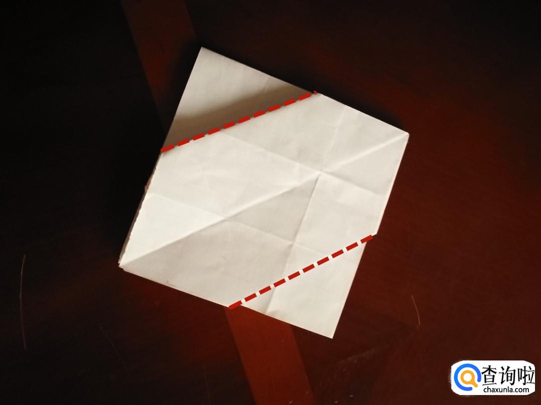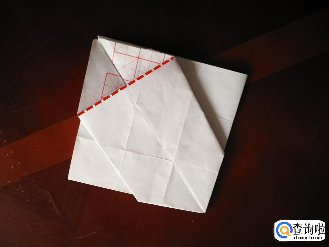 然后我们捏着纸折出来的两个对角,把他们折到一起,然后再沿着图中红线所示的轨迹,把角往里折。