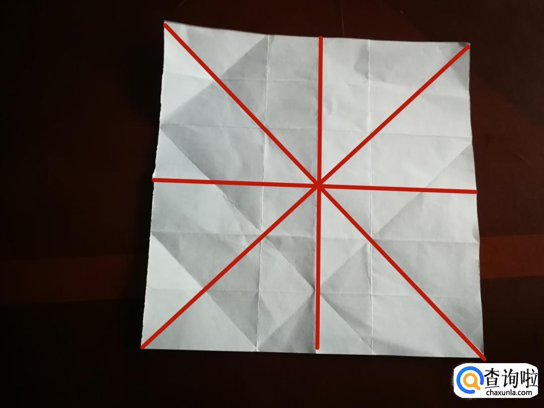 首先准备一张正方形的纸,什么颜色都可以,如果没有正方形的纸就用A4纸裁剪成正方形,然后沿着如图所示的轨迹进行折叠,再展开。