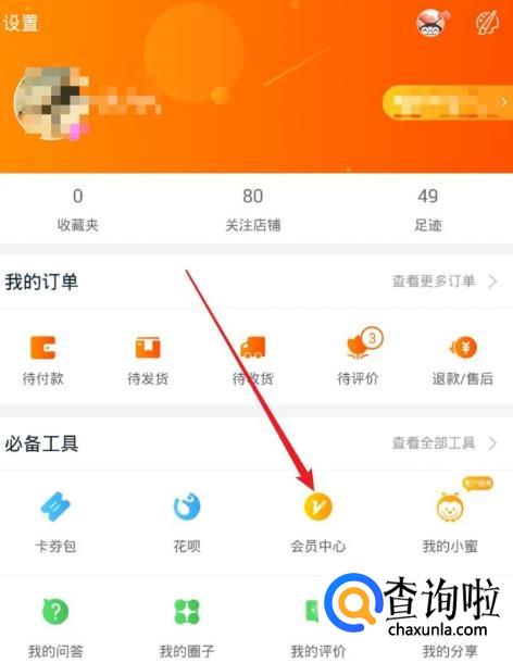 在我的淘宝面板中在必备工具中找到并点击“会员中心”。