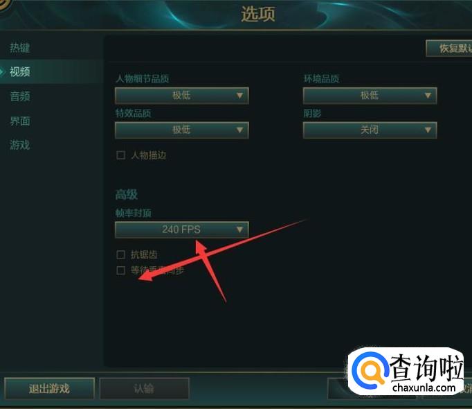 不过在这界面上还有一个最重要的地方,那就是高级选项的那个地方,在那个地方大家一定要看一下是否选定了等垂直同步,这个时候如果选定的话,一定要取消,这个是严重影响游戏的,还有就是帧数的设定,在游戏中是可以进行设置的,游戏的fps越低的话,那么游戏就会越卡,所以可以 调节为60以上。