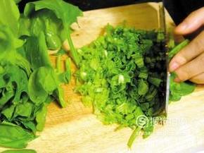 把芹菜、豆角、土豆、菠菜、胡萝卜切成丁,玉米颗粒碾碎混合在一个大一点的盆里