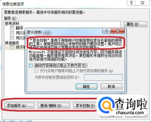 当然,有些人觉得“信息检索”服务有用,我们除了面板中有的服务,还可以点击下方的“添加服务”、“更新删除”、“家长控制”按钮,对信息检索进行自定义设置,添加需要的检索服务,比如,启用家长控制,可以阻止检索到一些不良内容。