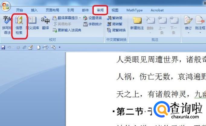 首先,我们打开Word2010,如图所示,点击“审阅”,在工具栏中就有“信息检索”按钮,我们点击一下。