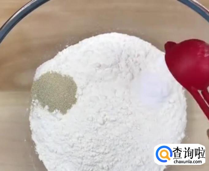 首先,面粉适量,加入少许酵母,适量盐,搅拌均匀
