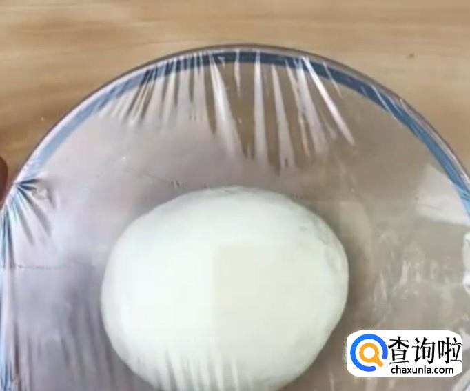我们将面团放入碗中,盖上保鲜膜,如下图所示,静置在阴凉处发面
