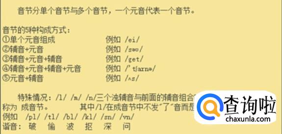 首先,英语的音节基本上是五种构成,还有一些特殊情况。一个元音音素的出现就代表有一个音节。特殊情况就是I、m、n这三个浊辅音,只要与前面的辅音组合在一起也是一个音节,叫成音节。