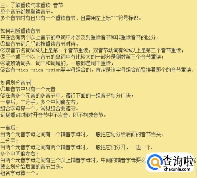 其次,重读音和音节的划分也很简单。单个音节都是重读音节,多个音节时有且只有一个重读音节的,在重读音节上面会有“'”的标记。