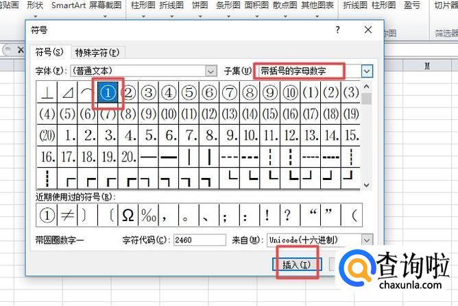 弹出的界面,我们将子集设置为带括号的字母数字,之后我们点击一个带圈的数字,然后我们点击插入;