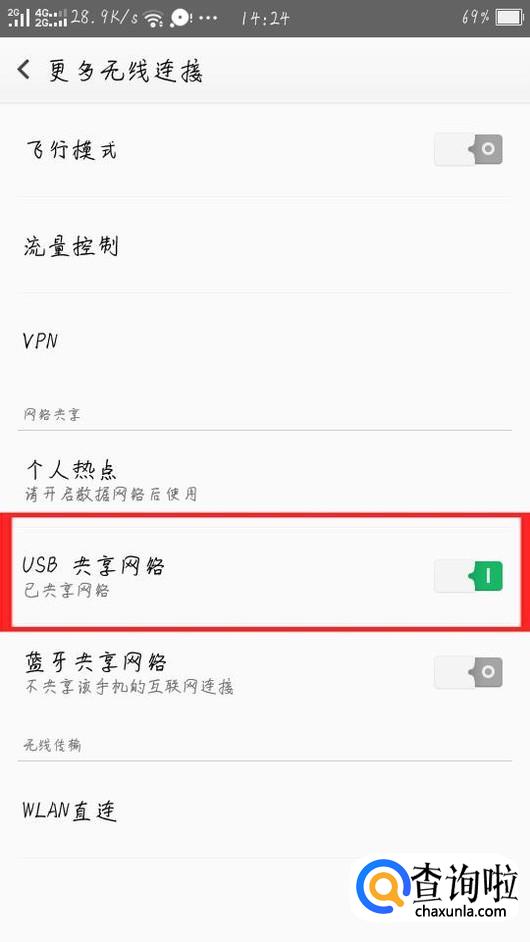 进入更多界面后,将“USB共享网络”的开关打开,这样电脑就联网啦!