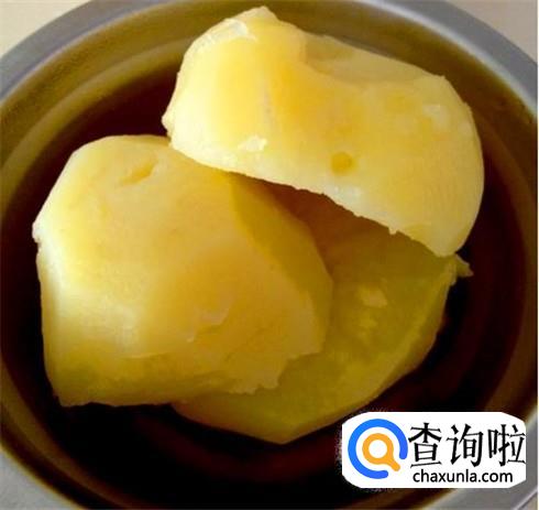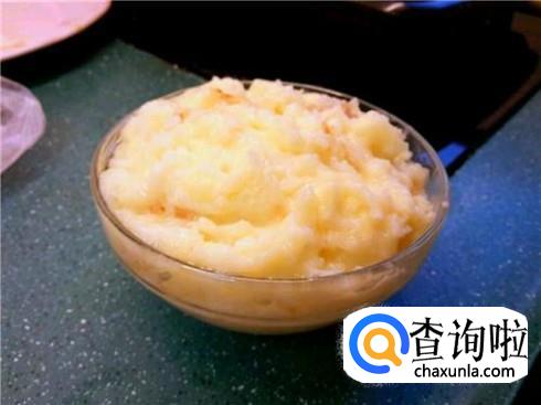 土豆蒸熟之后,放凉将土豆皮去掉,放进盘子里用勺子压碎,将其压成土豆泥。