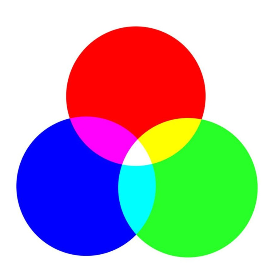 色彩中颜料调配三原色混合色为黑色,而三原色作为光基材料中由于光的特殊属性混合色为白色。