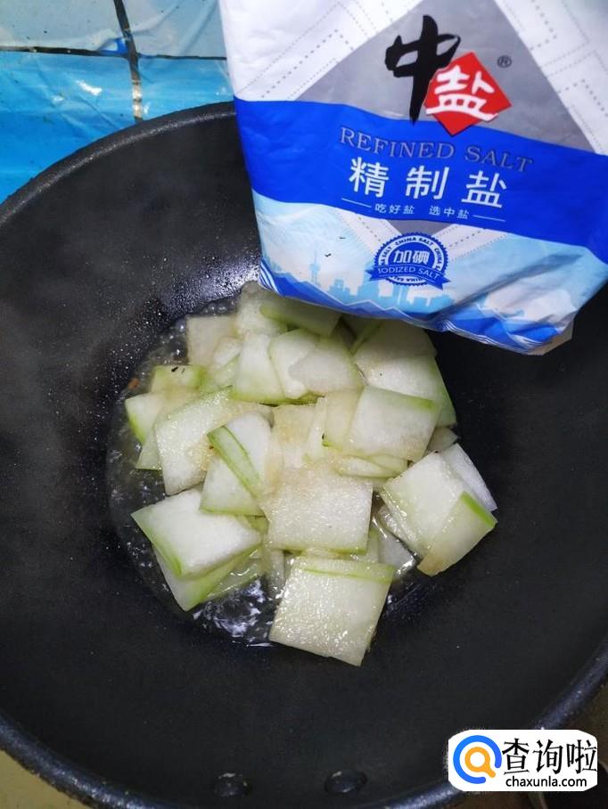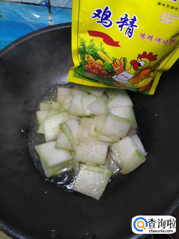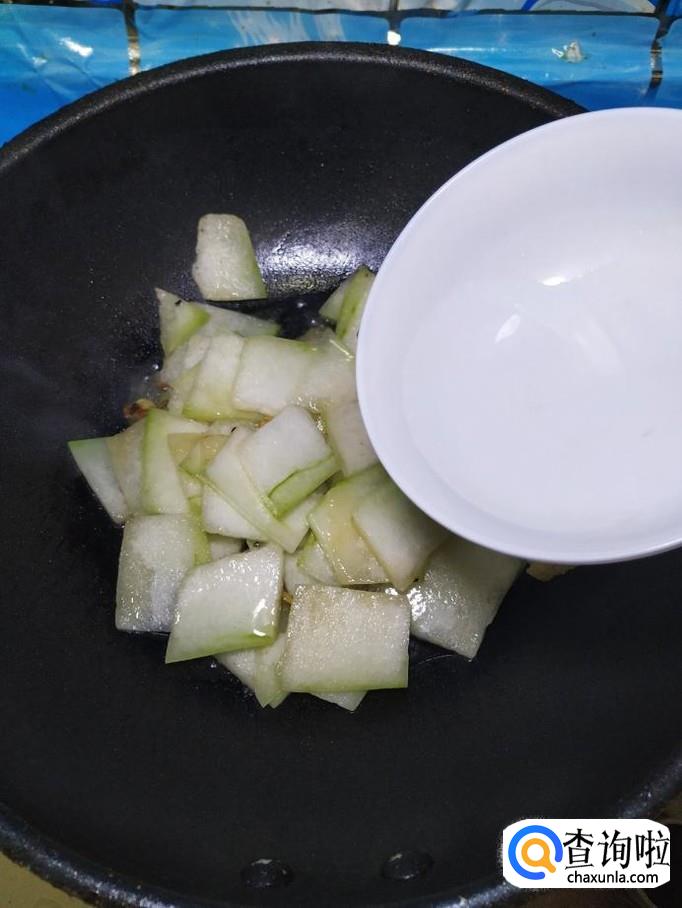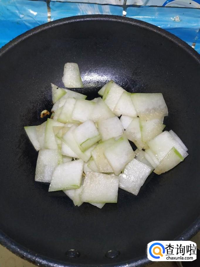 将准备好的冬瓜片儿,倒入锅中,翻炒均匀,炒至冬瓜微微透明,就差不多了。