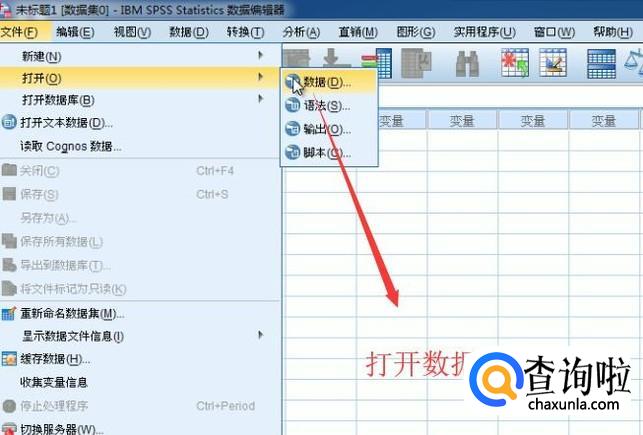 首先在SPSS软件中点击文件菜单,选择打开下的数据选项,如下图所示