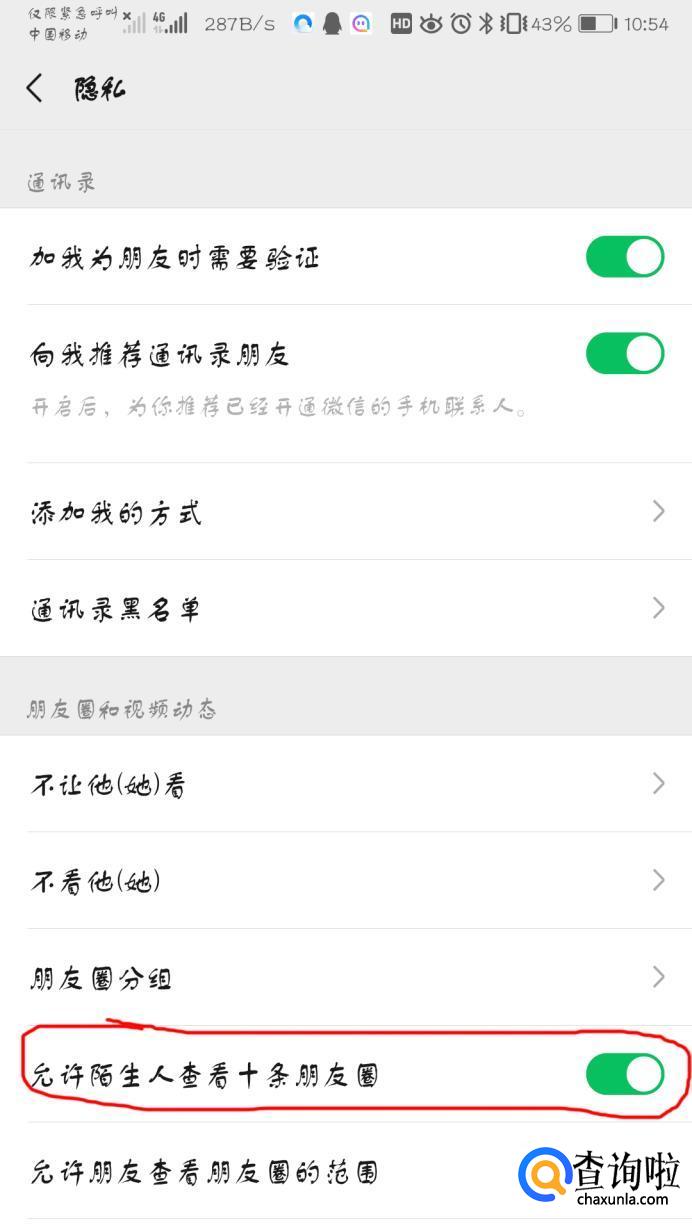 在此界面设置成如下图所示,将“允许陌生人查看十条朋友圈”关闭。