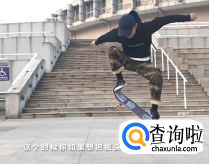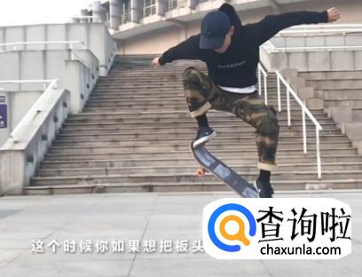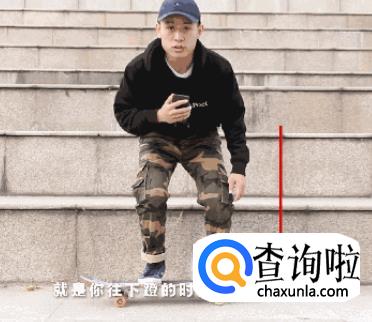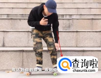 摆小腿:当你的前脚向上收起超过前桥钉组的时候,这个时候要向前方去推滑板的板头,记得是推板头而不是板肚子(杠杆原理),另外记得推的这个过程,从水平面看过去,你的小腿像是画了一个扇形。