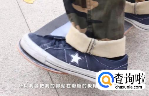 脚位:前脚放置于滑板正中与前桥钉组之间的区域,后脚放在板尾上与前脚成一个微外八的角度,后脚外侧边缘可以与滑板板尾齐平。