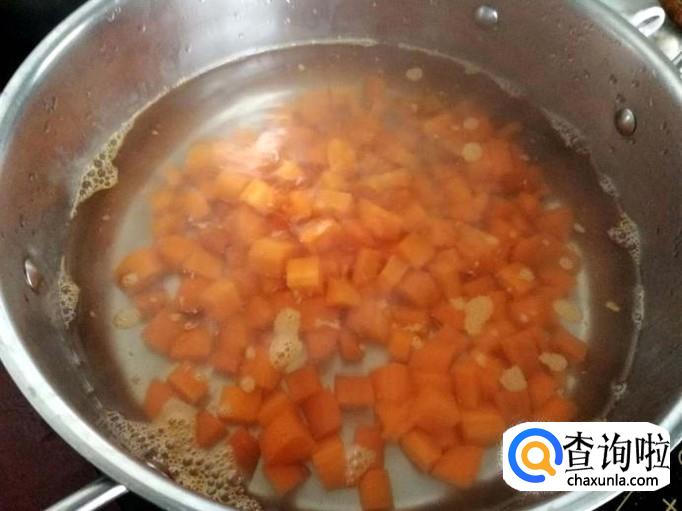 起锅烧水,水开后将胡萝卜粒放入沸水中煮熟。