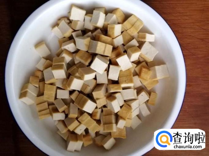 豆腐干温水洗净表面后,切成小丁。