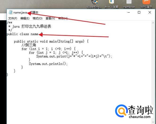 然后查看自己编写的java语言的文件名字是不是和 class 后加的一致。