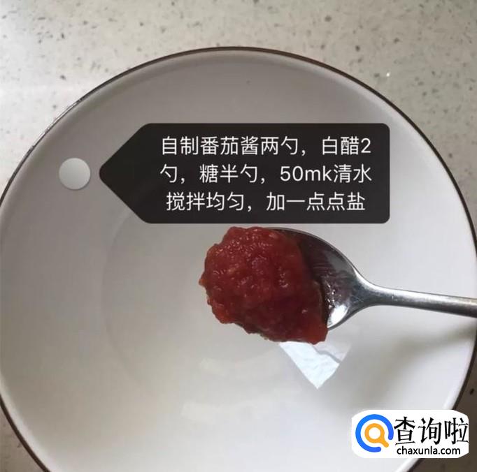 然后在一个碗中加入两勺自制的番茄酱,白醋两勺,糖半勺,50ml的清水和适量盐搅拌均匀,如下图所示。
