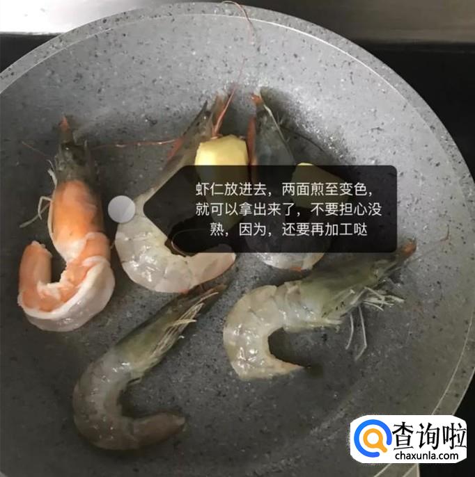 接着把虾仁倒进锅中煎至两面变色,如下图所示。