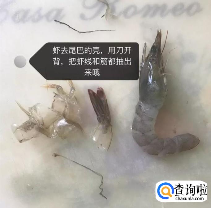 然后将鲜虾开背,去尾去壳去虾线,如下图所示。