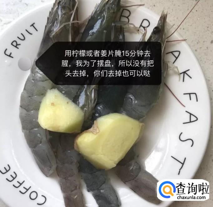 接着将大虾用柠檬或者姜片腌制15分钟,如下图所示。小贴士:如果大家不想摆盘,也可以把大虾的头去掉。