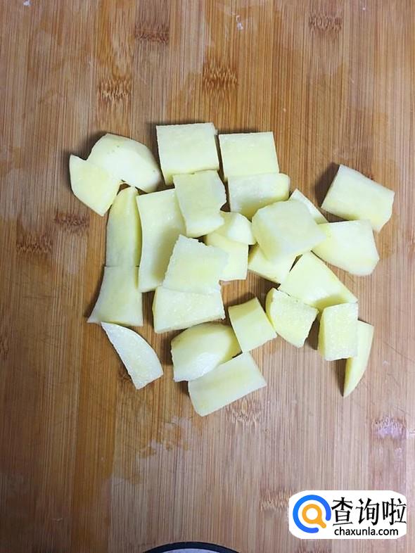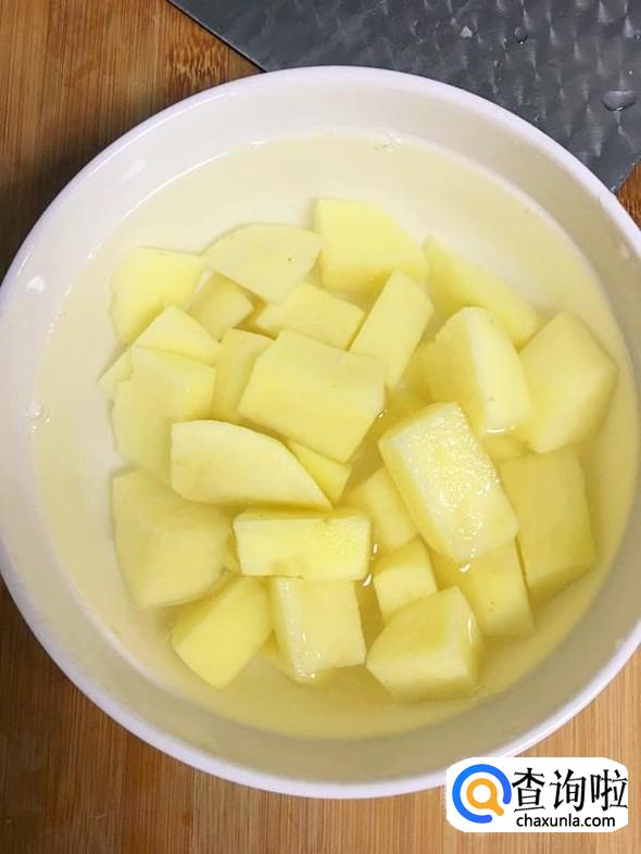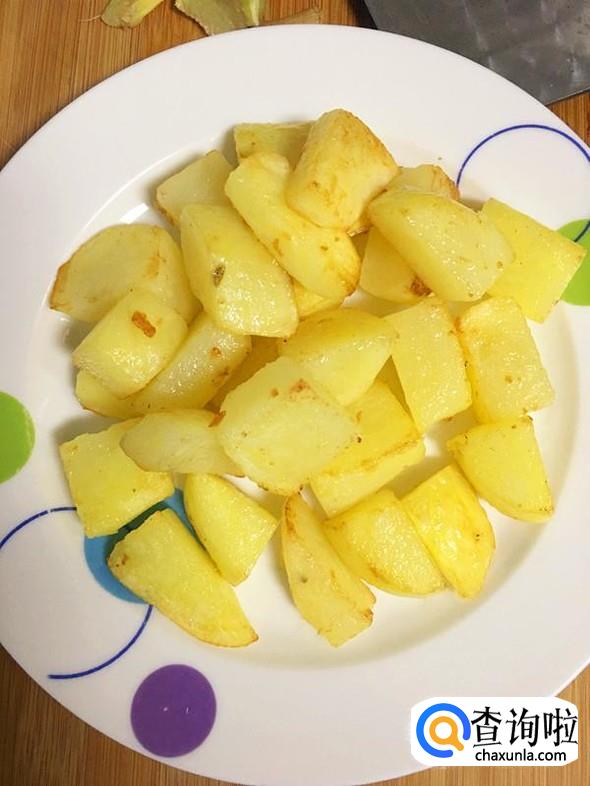 油锅烧热,把土豆块捞出,沥干水分后放入锅中煎至淡淡的金黄色后盛出,放入盘中待用。