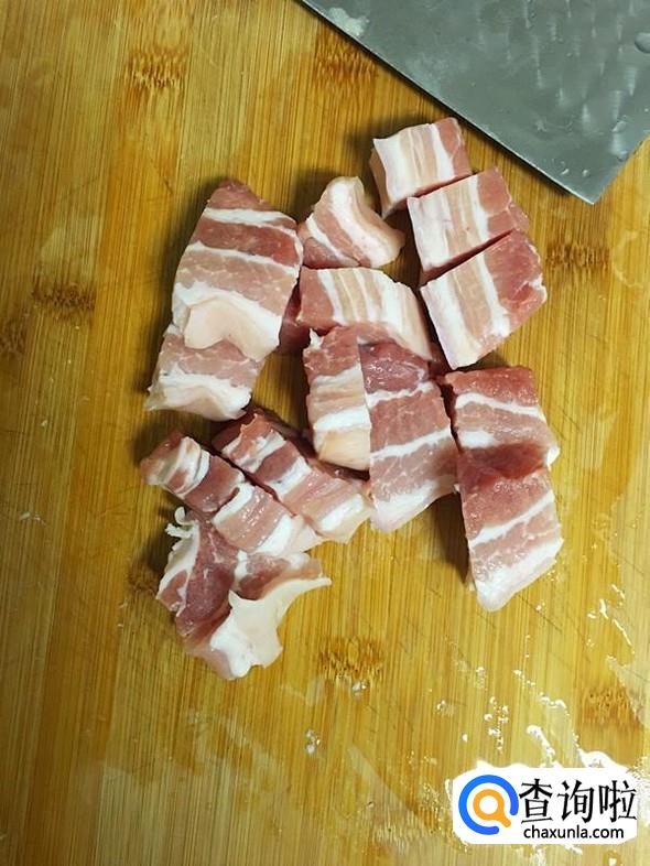 五花肉用温水清洗干净后,切成厚一点的肉片。