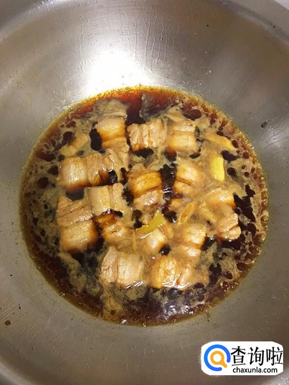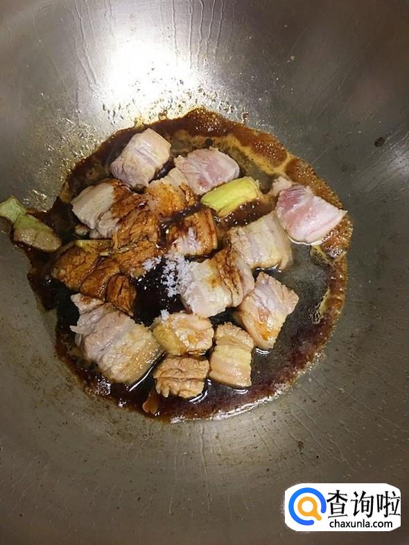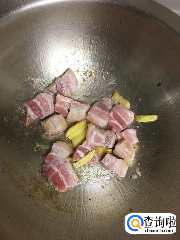 油锅继续加热,放入少许姜片,炒出香味后,加入五花肉片。