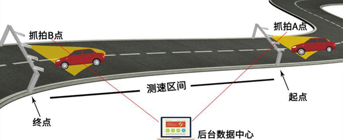 区间测速是在同一路段上布设两个相邻的监控点,以便进行集中有效地管理,能为公安部门有效打击违章超速、肇事逃逸、可疑车辆等各种违法行为提供有效地技术支持。这些信息也可以用于对交通流量的自动分析、统计和用于对违法、违规车辆进行处理的法律依据。原理是基于车辆通过前后两个监控点的时间来计算车辆在该路段上的平均行驶速度,并依据该路段上的限速标准判定车辆是否超速违章。公式为:区间测速的平均速度=区间距离÷运行时间。