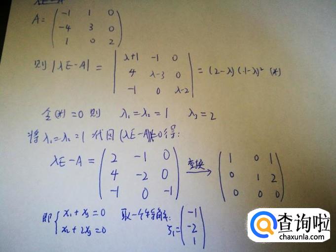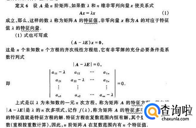 首先我们看看矩阵的特征值与特征向量的含义。对于一个n阶方阵A,若存在非零n维向量x与常数λ使得λx=Ax,则称λ是A的一个特征值,x是A属于特征值λ的特征向量。我们可以使用|λE-A|=0求解出A的特征之,然后反代回去求解特征向量(不唯一)。