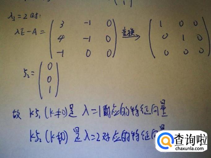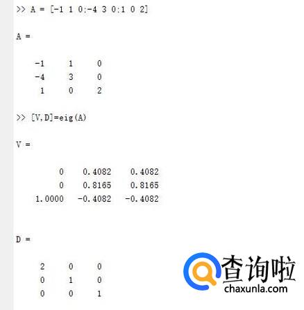 如果使用matlab求矩阵的特征值与特征向量,则使用命令eig(A)。我们用该命令求解上面的矩阵A,如图。由于特征向量不唯一,因此可能与我们求得的向量不同,不过它们之间只差一个倍数关系。