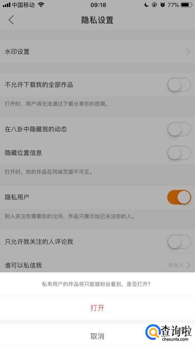接着点击开启私密用户开关,如下图所示。