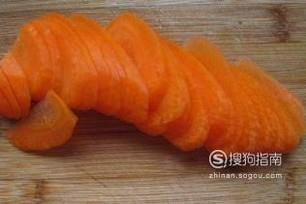 将胡萝卜放在案板上,左手按住胡萝卜,右手拿刀,用菜刀将胡萝卜切成片。