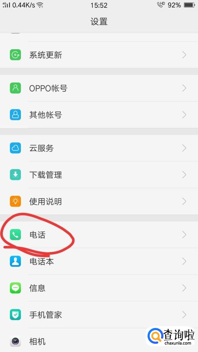 下滑设置列表找到“电话”选项,点击打开。