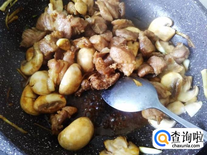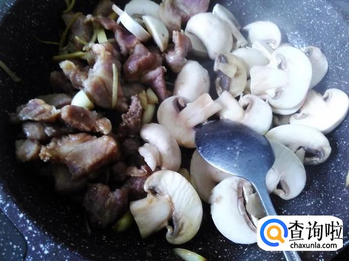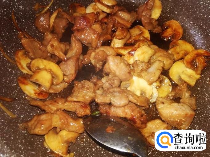 炒至肉片变色,然后铲到锅边,再下适量的油到锅空格,放蘑菇进去加适量的盐。