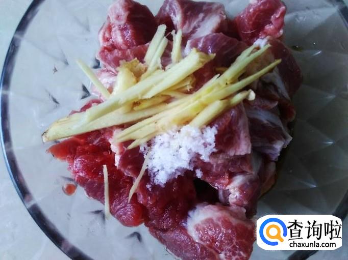 首先把猪肉清洗干净切成薄片,加适量的盐、姜丝、半小勺生抽、1勺料酒腌制几分钟。