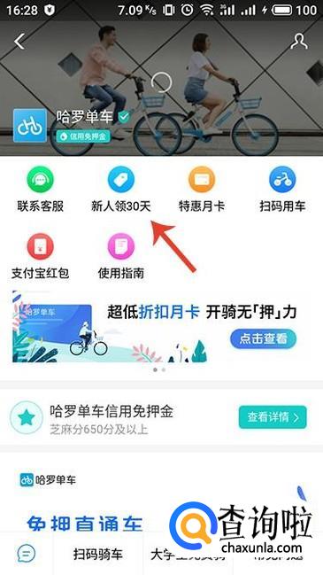 进入哈罗单车生活号主界面,在上方选项中点击“新人领30天”