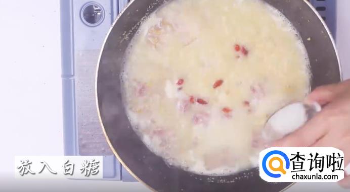 等煮沸后,将切好的咸肉片放进去,再加入适量枸杞,撒一些白糖,混合均匀。