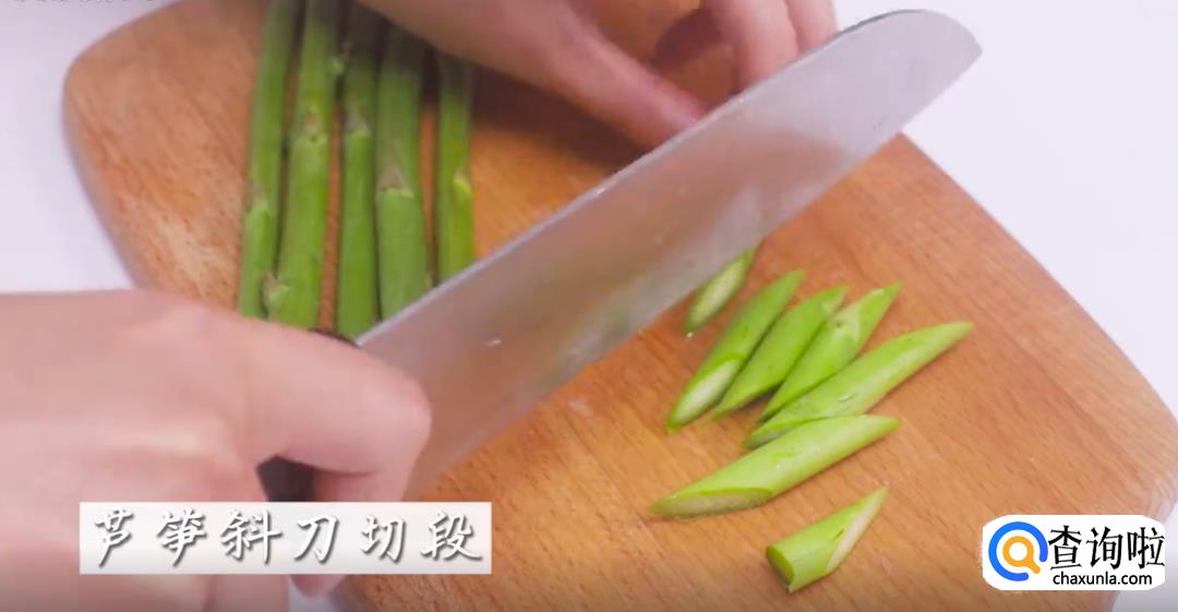 接着,把洗干净的芦笋切成段,注意切的时候刀要斜着,如下图所示。