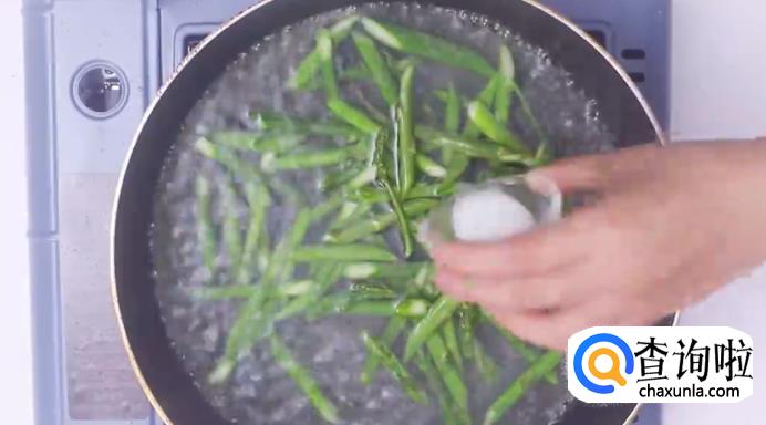 接下来,烧一锅水,水煮沸后放入芦笋,再往水中加适量的盐。