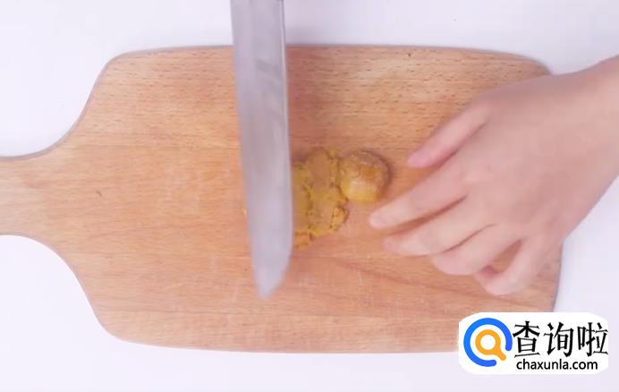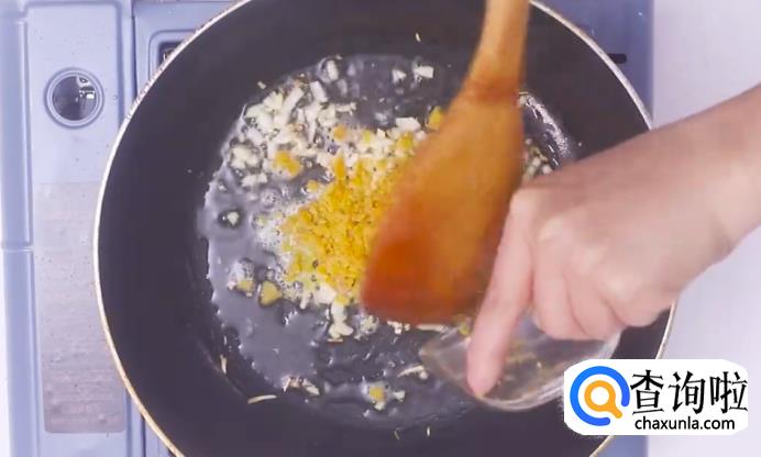 再将压碎的蛋黄倒入,转为小火开始翻炒。
