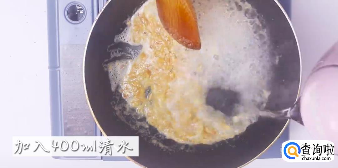 翻炒均匀后,淋入料酒,再加入400毫升的清水。