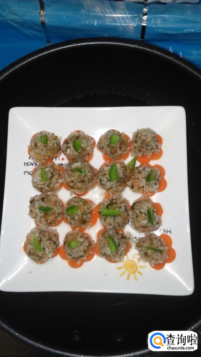 冷水上锅,盖上锅盖儿,蒸20分钟,就熟了,然后在丸子上面摆上青椒粒,珍珠丸子更加漂亮了。