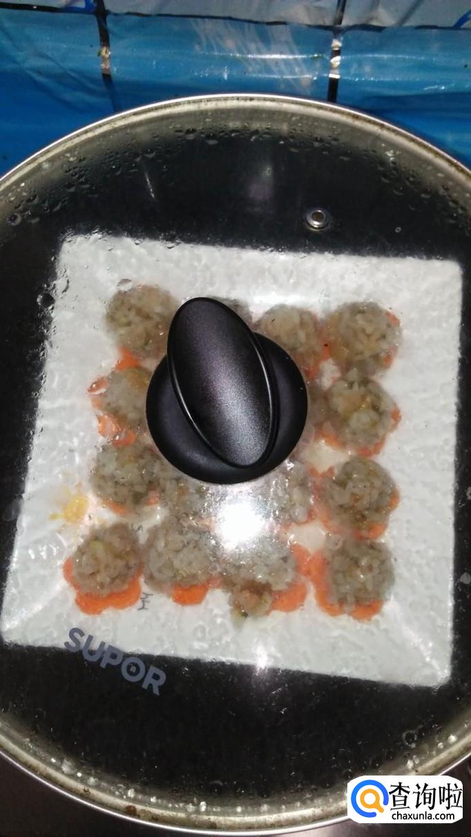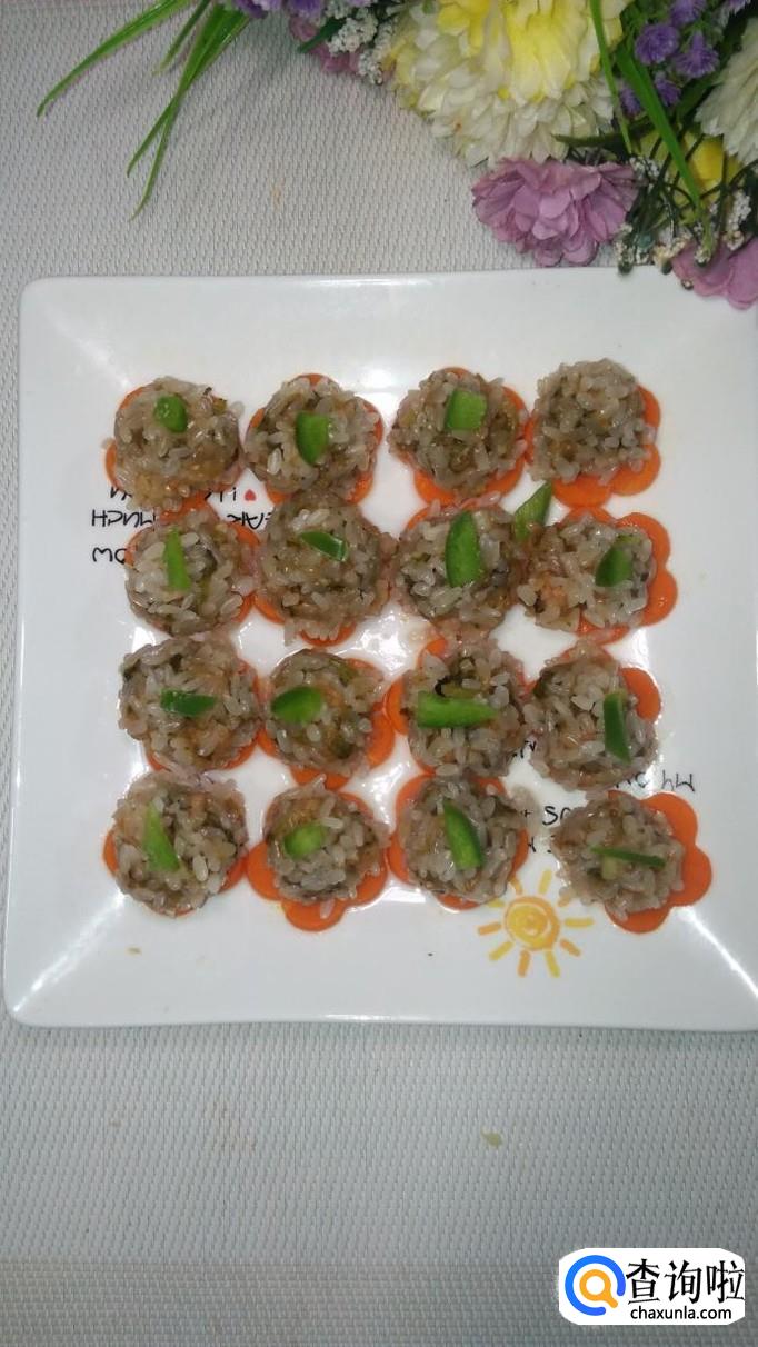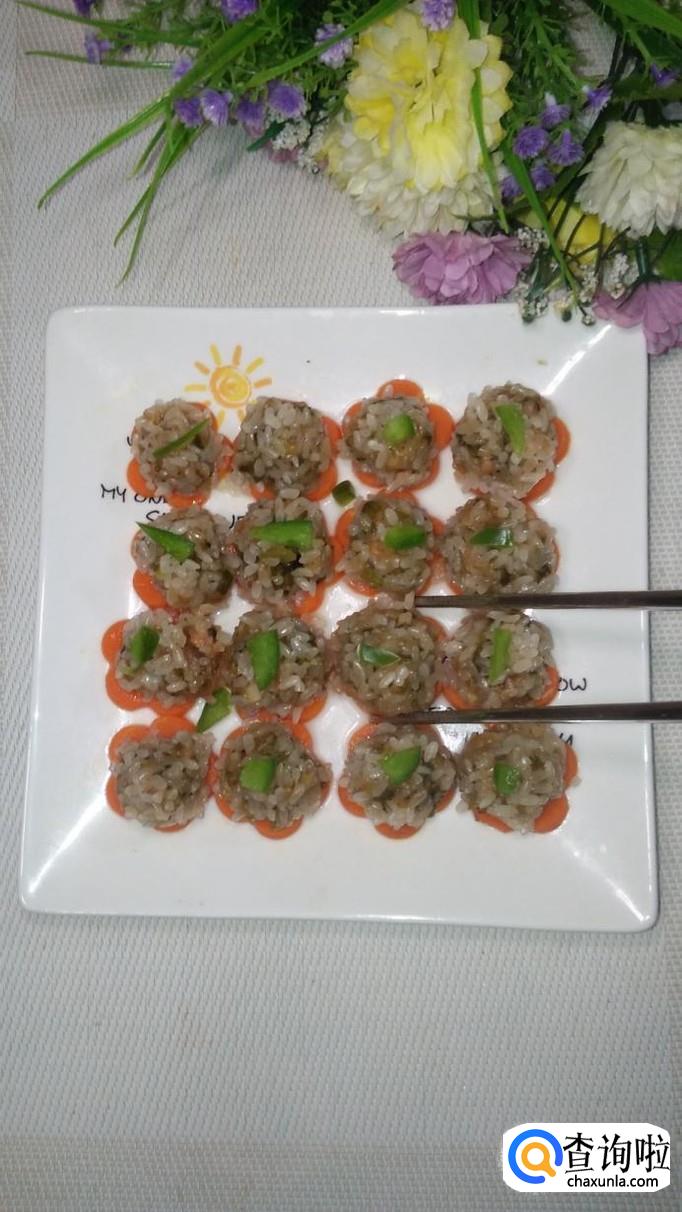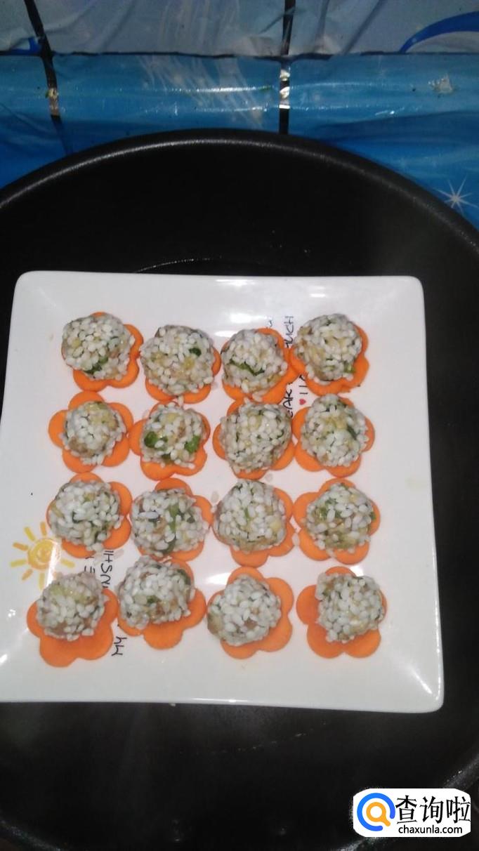准备适量糯米,提前泡五个小时以上,然后将肉馅搓成丸子,滚上一层糯米粉,放在胡萝卜花上,全部放好后,放入蒸锅。